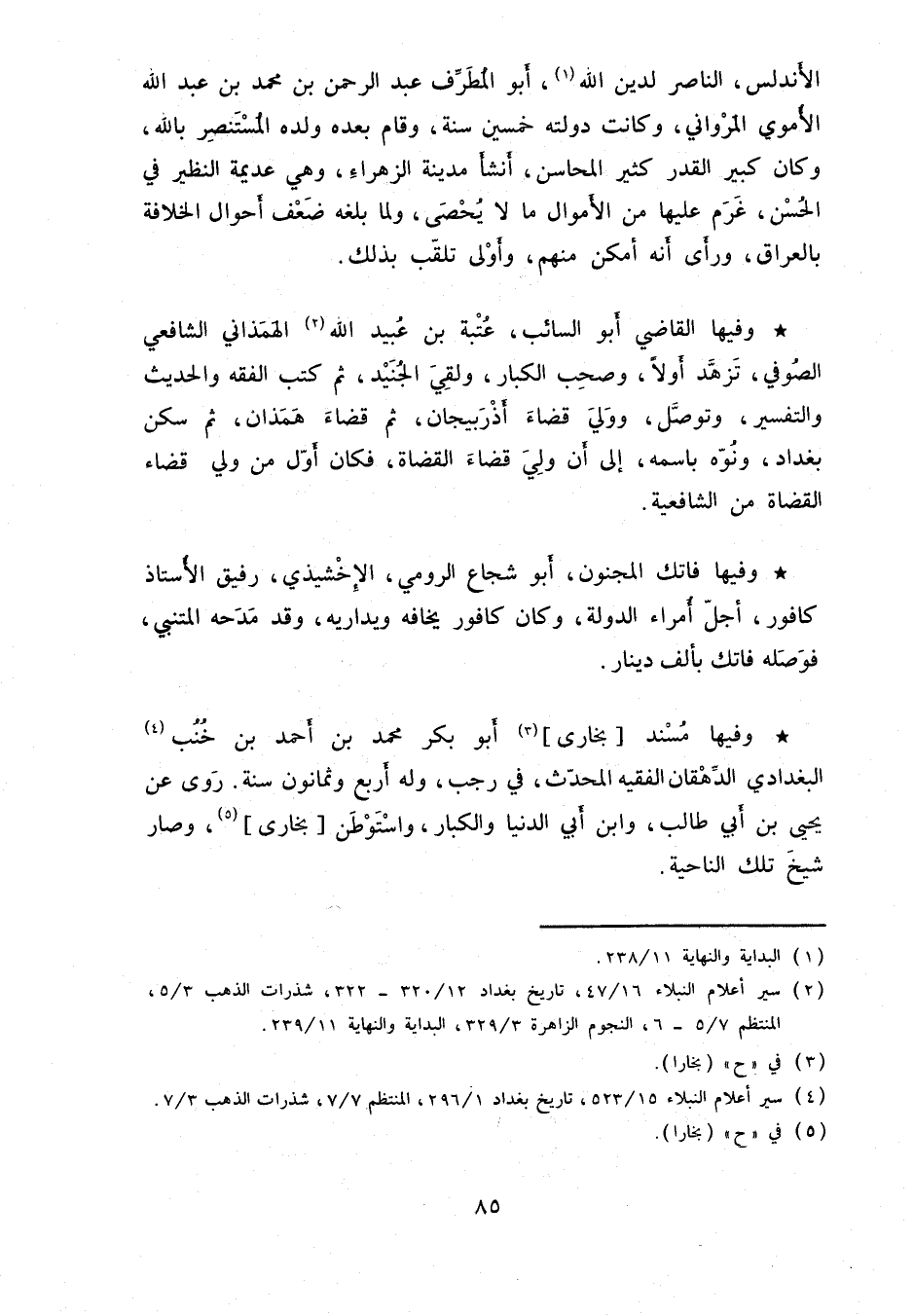 وفيها القاضي أبو السائب، عتبة بن عبيد الله الهمذاني الشافعي الصوفي، تزهَّد أولاً، وصحب الكبار، ولقي الجنيد، ثم كتب الفقه والحديث والتفسير، وتوصَّل، وولي قضاء أذربيجان، ثم قضاء همذان، ثم سكن بغداد، ونوّه باسمه، إلى أن ولي قضاء القضاة، فكان أوّل من ولي قضاء القضاة من الشافعية.