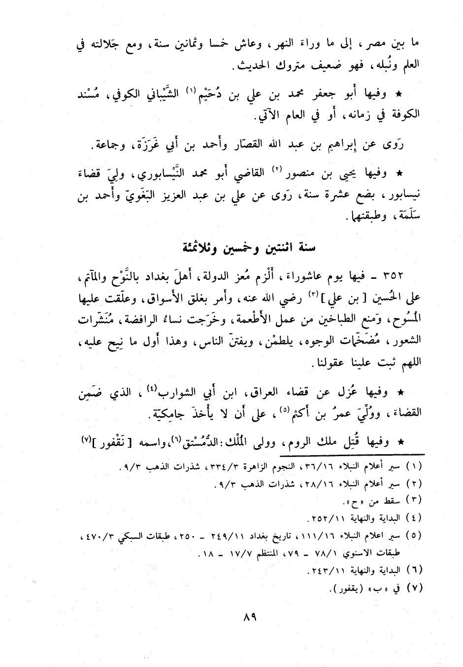 فيها يوم عاشوراء، ألزم معز الدولة، أهل بغداد بالنَّوح والمآتم، على الحسين بن علي رضي الله عنه، وأمر بغلق الأسواق، وعلّقت عليها المسوح، ومنع الطباخين من عمل الأطعمة، وخرجت نساء الرافضة، منشّرات الشعور، مضخّمات الوجوه، يلطمن، ويفتنّ الناس، وهذا أول ما نيح عليه، اللهم ثبت علينا عقولنا.