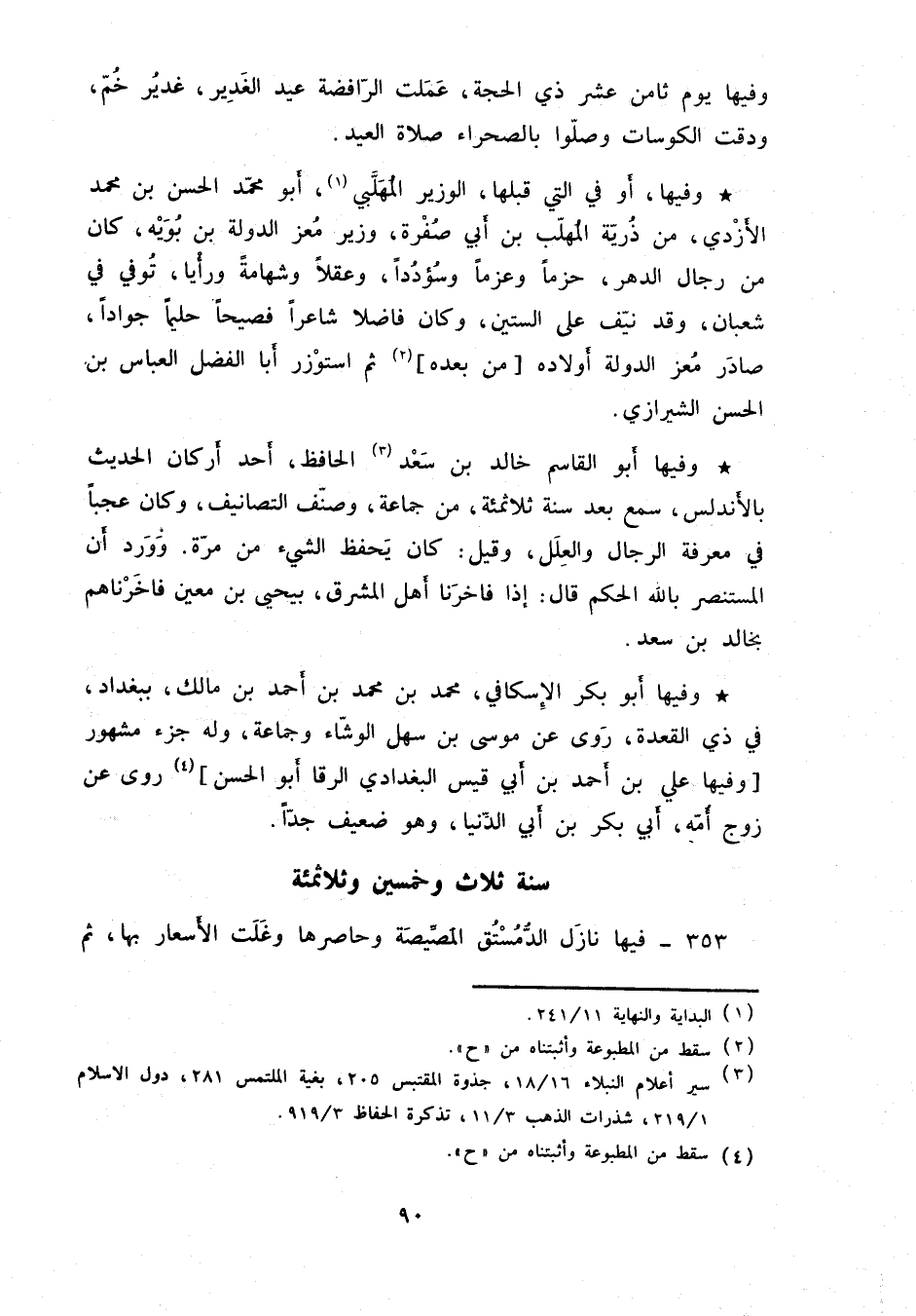 وفيها، أو في التي قبلها، الوزير المهلَّبي، أبو محمّد الحسن بن محمد الأزدي، من ذريّة المهلّب بن أبي صفرة، وزير معز الدولة بن بويه، كان من رجال الدهر، حزماً وعزماً وسؤدداً، وعقلاً وشهامةً ورأياً، توفي في شعبان، وقد نيّف على الستين، وكان فاضلاً شاعراً فصيحاً حليماً جواداً، صادر معز الدولة أولاده من بعده ثم استوزر أبا الفضل العباس بن الحسن الشرازي.
