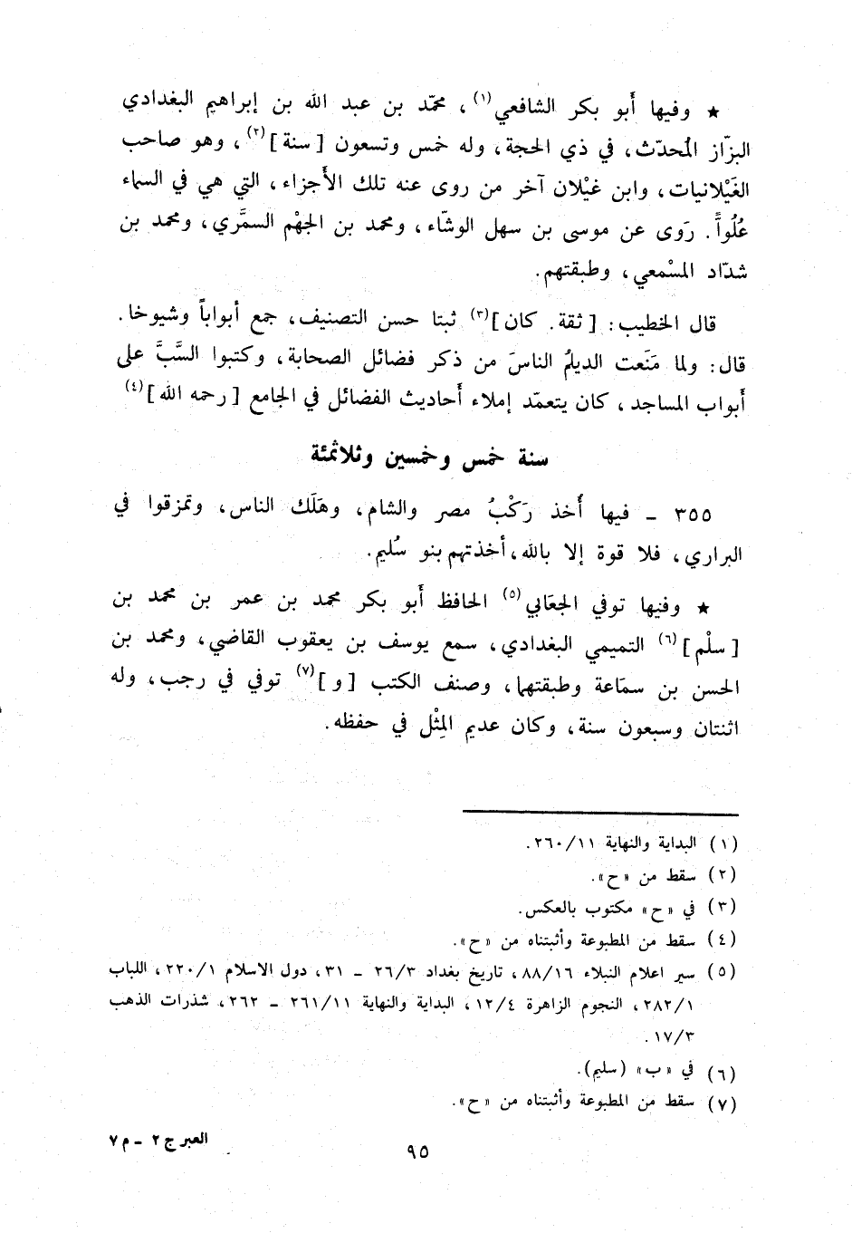 وفيها أبو بكر الشافعي، محّمد بن عبد الله بن إبراهيم البغدادي البزّاز المحدّث، في ذي الحجة، وله خمس وتسعون سنة، وهو صاحب الغيلانيات، وابن غيلان آخر من روى عنه تلك الأجزاء، التي هي في السماء علواًّ. روى عن موسى بن سهل الوشّاء، ومحمد بن الجهم السمَّري، ومحمد بن شدّاد المسمعي، وطبقتهم.