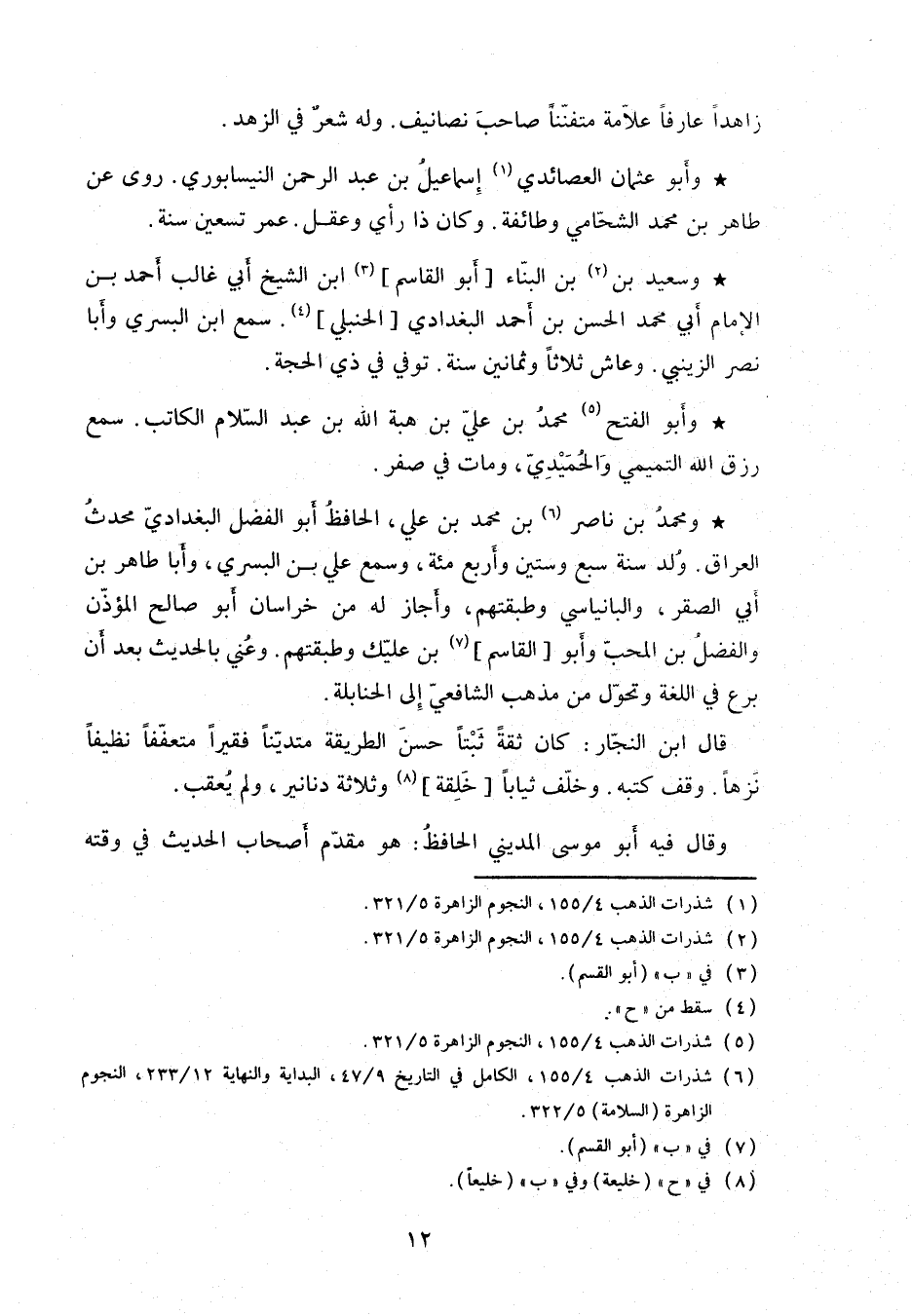 ومحمد بن ناصر بن محمد بن علي، الحافظ أبو الفضل البغدادي محدث العراق. ولد سنة سبع وستين وأربع مئة، وسمع علي بن البسري، وأبا طاهر بن أبي الصقر، والبانياسي وطبقتهم، وأجاز له من خراسان أبو صالح المؤذن والفضل بن المحب وأبو القاسم بن عليك وطبقتهم. وعني بالحديث بعد أن برع في اللغة وتحول من مذهب الشافعي إلى الحنابلة. قال ابن النجار: كان ثقة ثبتاً حسن الطريقة متديتاً فقيراً متعففاً نظيفاً نزهاً. وقف كتبه. وخلف ثياباَ ً خلقة وثلاثة دنانير، ولم يعقب. وقال فيه أبو موسى المديني الحافظ: هو مقدم أصحاب الحديث في وقته