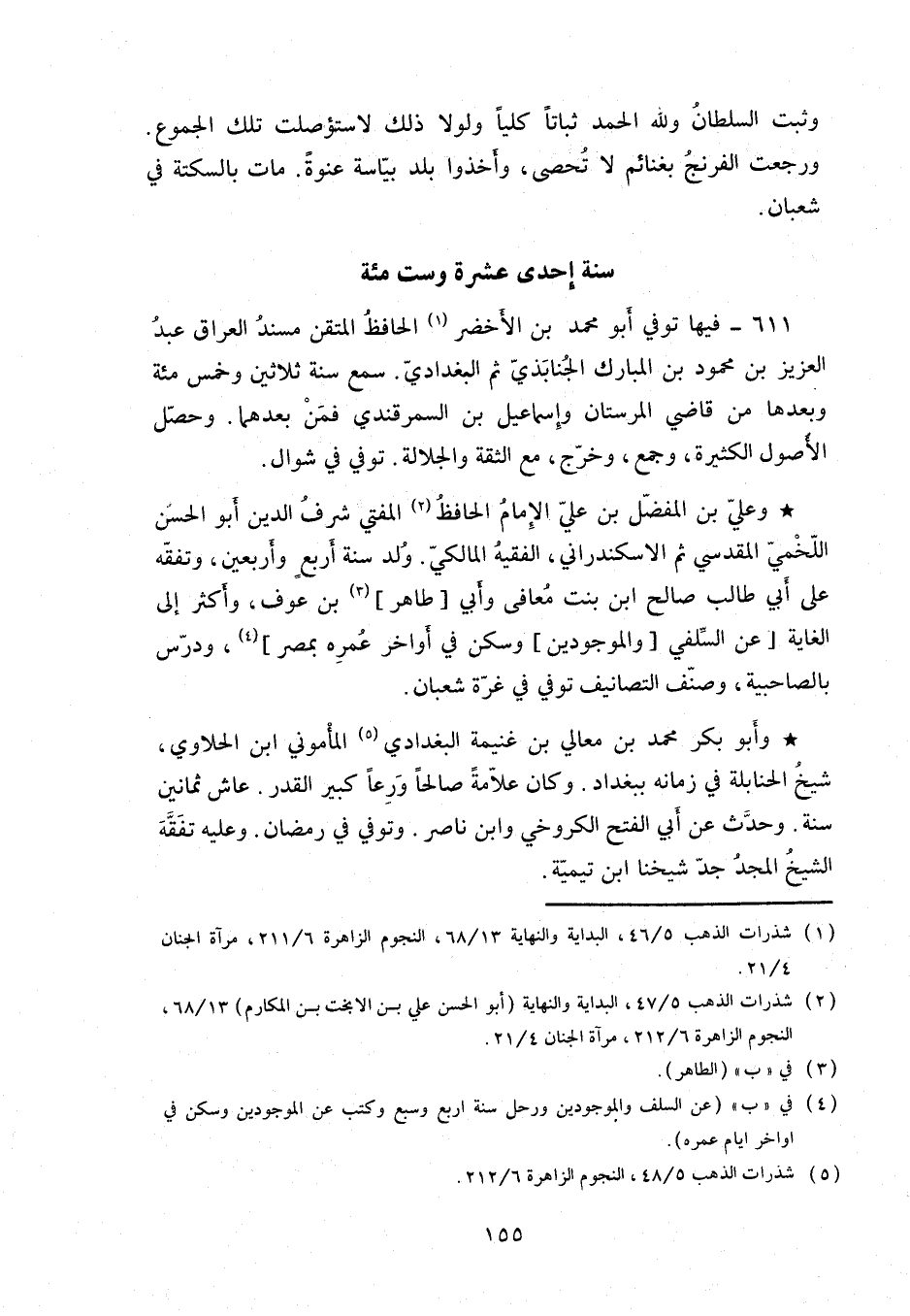 فيها توفي أبو محمد بن الأخضر الحافظ المتقن مسند العراق عبد العزيز بن محمود بن المبارك الجنابذي ثم البغدادي.
