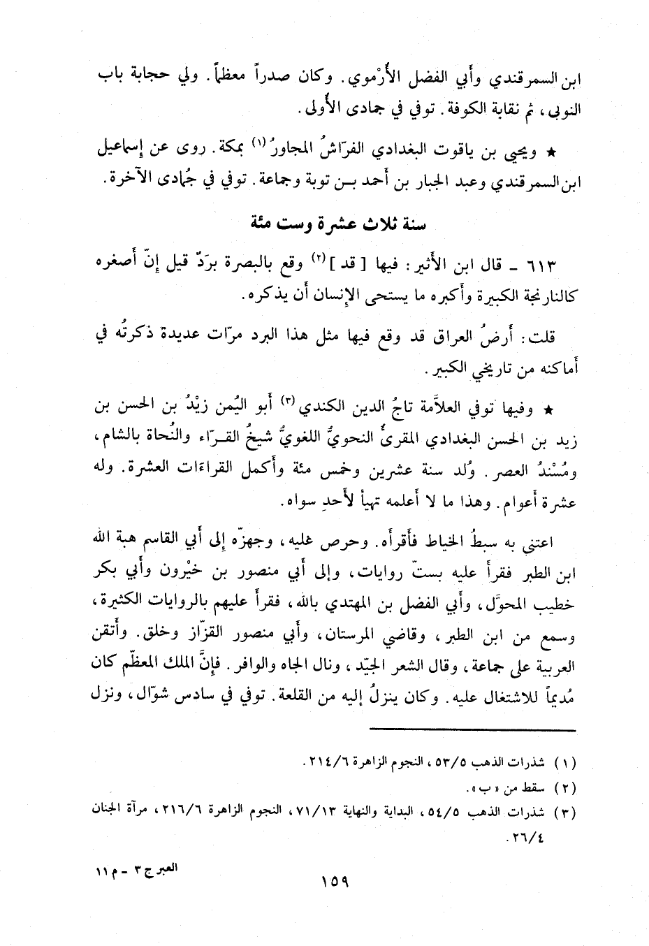 وفيها توفي العلامة تاج الدين الكندي أبو اليمن زيد بن الحسن بن زيد بن الحسن البغدادي المقرئ النحوي اللغوي شيخ القراء والنجاة بالشام ومسند العصر.