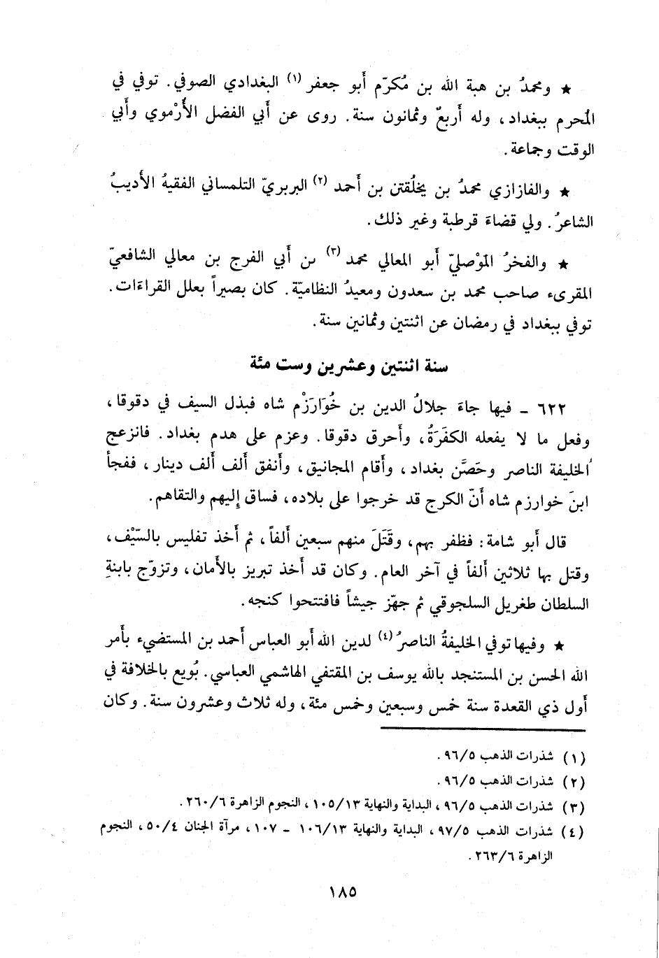 وفيها توفي الخليفة الناصر لدين الله أبو العباس أحمد بن المستضيء بأمر الله الحسن بن المستنجد بالله يوسف بن المقتفي الهاشمي العباسي.