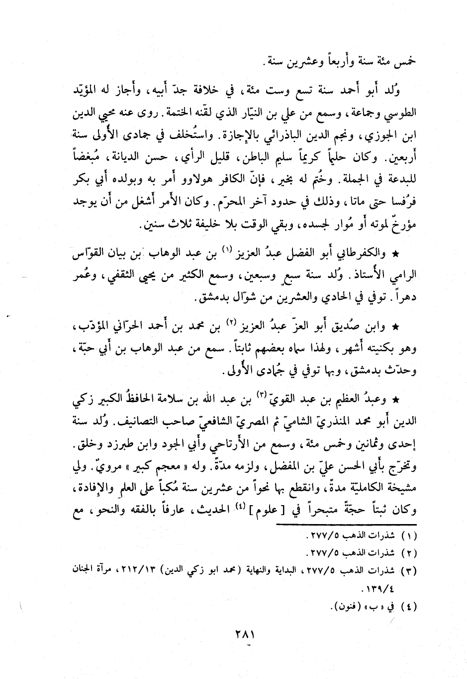 وعبد العظيم بن عبد القوي بن عبد الله بن سلامة الحافظ الكبير زكي الدين ابو محمد المنذري الشامي ثم المصري الشافعي صاحب التصانيف , ولد سنة إحدى وثمانين وخمس مائة وسمع من الأرتاحي وأبي الجود وابن طبرزد وخلق.