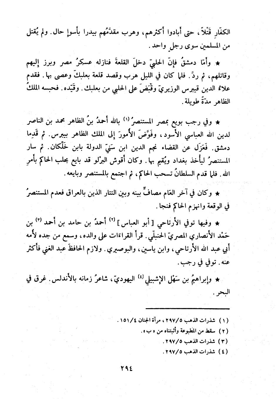وكان فيآخر العام مصاف بينه وبين التتار الذين بالعراق فعدم المستنصر في الوقعة وانهزم الحاكم فنجا.