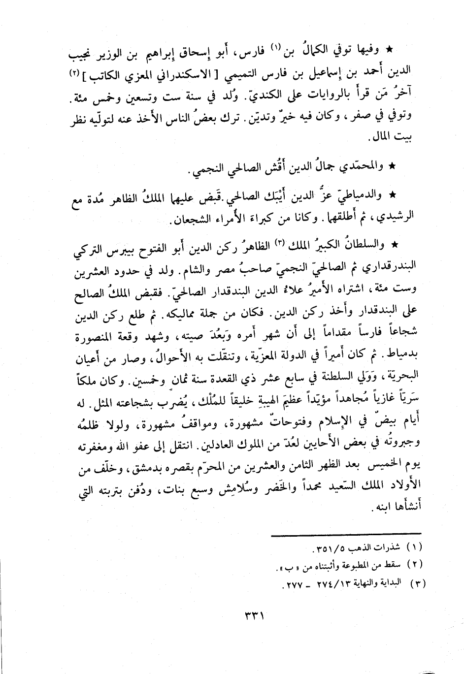 والسلطان الكبير الملك الظاهر ركن الدين أبو الفتوح بيبرس التركي البندرقداري ثم الصالحي النجمي صاحب مصر والشام.