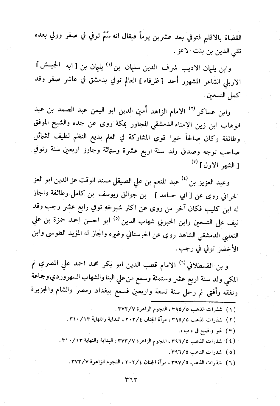 وعبد العزيز بن عبد المنعم بن علي الصيقل مسند الوقت عز الدين أبو العز الحراني روى عن أبي حامد بن جوالق ويوسف بن كامل وطائفة وأجاز له ابن كليب فكان آخر من روى عن أكثر شيوخه توفي رابع عشر رجب وقد نيف علىالتسعين وابن الحبوبي شهاب الدين أبو الحسن أحمد حمزة بن علي الثعلبي الدمشقي الشاهد روى عن الحرستاني وغيره وأجاز له المؤيد الطوسي وابن الأخضر توفي في رجب.