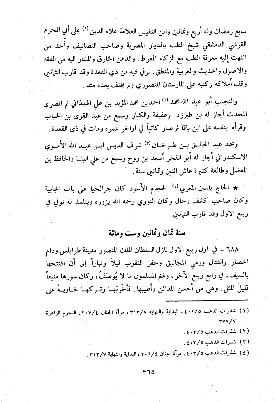 في أول ربيع الأول نازل السلطان الملك المنصور مدينة طرابلس ودام الحصار والقتال ورمي