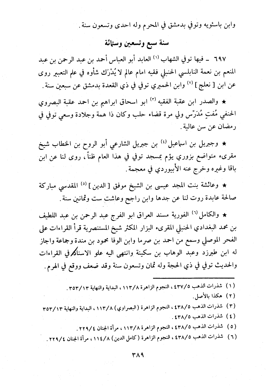 فيها توفي الشهاب العابد أبو العباس أحمد بن عبد الرحمن بن عبد المنعم بن نعمة النابلسي الحنبلي فقيه إمام لا يدرك شأوه في علم التعبير روى عن ابن نعلج وابن الحميري توفي في ذي والصدر ابن عقبة الفقيه أبو إسحاق إبراهيم بن أحمد عقبة البصروي الحنفي مفت مدرس ولي قضاء مرة حلب وكان ذا همة وجلادة وسعي توفي في رمضان عن سن عالية.