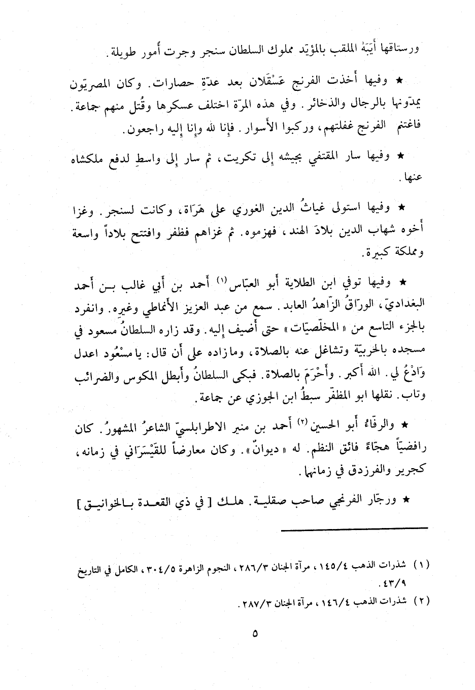 وفيها توفي ابن الطلاية أبو العباس أحمد بن أبي غالب بن أحمد البغدادي، الوراق الزاهد العابد. سمع من عبد العزيز الأنماطي وغيره. وانفرد بالجزء التاسع من المخلصيات حتى أضيف إليه. وقد زاره السلطان مسعود في مسجده بالحربية وتشاغل عنه بالصلاة، وما زاده على أن قال: يا مسعود اعدل وادع لي. الله أكبر. وأحرم بالصلاة. فبكى السلطان وأبطل المكوس والضرائب وتاب. نقلها أبو المظفر سبط ابن الجوزي عن جماعة.