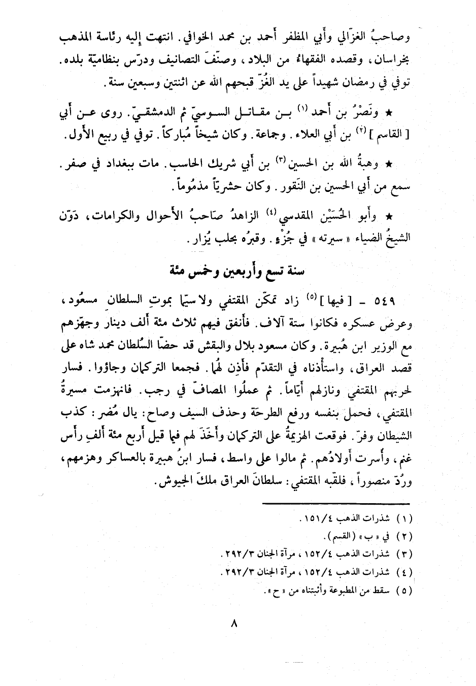 فيها زاد تمكن المقتفي ولاسيما بموت السلطان مسعود، وعرض عسكره فكانوا ستة آلاف. فأنفق فيهم ثلاث مئة ألف دينار وجهزهم مع الوزير ابن هبيرة. وكان مسعود بلال والبقش قد حضا السلطان محمد شاه على قصد العراق، واستأذناه في التقدم فأذن لهما. فجمعا التركمان وجاؤوا. فسار لحربهم المقتفي ونازلهم أياماً. ثم عملوا المصاف في رجب. فانهزمت مسيرة المقتفي، فحمل بنفسه ورفع الطرحة وحذف السيف وصاح: يال مضر: كذب الشيطان وفر. فوقعت الهزيمة على التركمان وأخذ لهم فيما قيل أربع مئة ألف رأس غنم، وأسرت أولادهم. ثم مالوا على واسط، فسار ابن هبيرة بالعساكر وهزمهم، ورد منصوراً، فلقبه المقتفي: سلطان العراق ملك الجيوش.