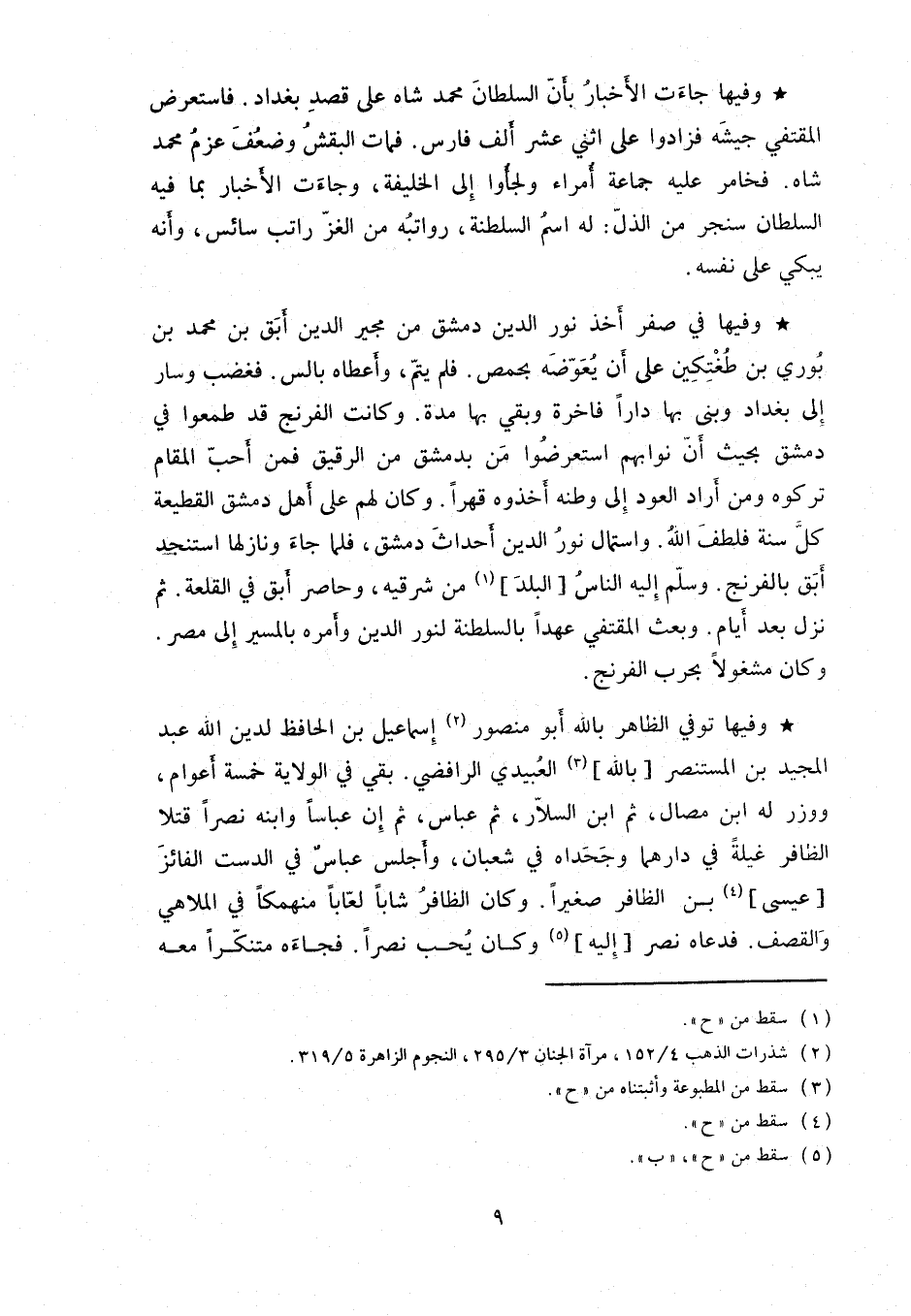 وفيها في صفر أخذ نور الدين دمشق من مجير الدين أبق بن محمد بن بوري بن طغتكين على أن يعوضه بحمص. فلم يتم، وأعطاه بالس. فغضب وسار إلى بغداد وبنى بها داراً فاخرة وبقي بها مدة. وكانت الفرنج قد طمعوا في دمشق بحيث أن نوابهم استعرضوا من بدمشق من الرقيق فمن أحب المقام تركوه ومن أراد العود إلى وطنه أخذوه قهراً. وكان لهم على أهل دمشق القطيعة كل سنة فلطف الله. واستمال نور الدين أحداث دمشق، فلما جاء ونازلهم استنجد أبق بالفرنج. وسلم إليه الناس البلد من شرقيه، وحاصر أيق في القلعة. ثم نزل بعد أيام. وبعث المقتفي عهداً بالسلطنة لنور الدين وأمره بالمسير إلى مصر وكان مشغولاً بحرب الفرنج.