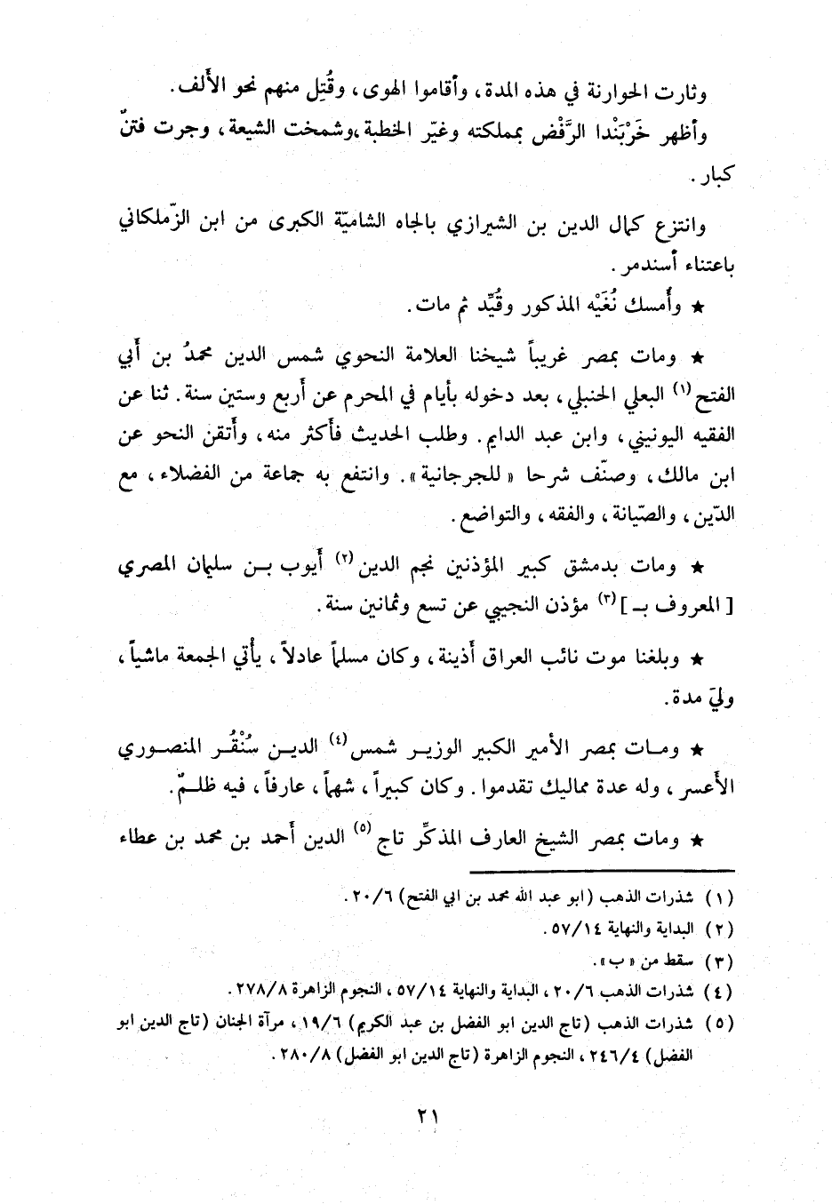 ومات بمصر غريباً شيخنا العلامة النحوي شمس الدين محمد بن أبي الفتح البعلي الحنبلي، بعد دخوله بأيام في المحرم عن أربع وستين سنة. ثنا عن الفقيه اليونني، وابن عبد الدايم. وطلب الحديث فأكثر منه، وأتقن النحو عن ابن مالك، وصنف شرحاً للجرجانية. وانتفع به جماعة من الفضلاء، مع الدين، والصيانة، والفقه، والتواضع.