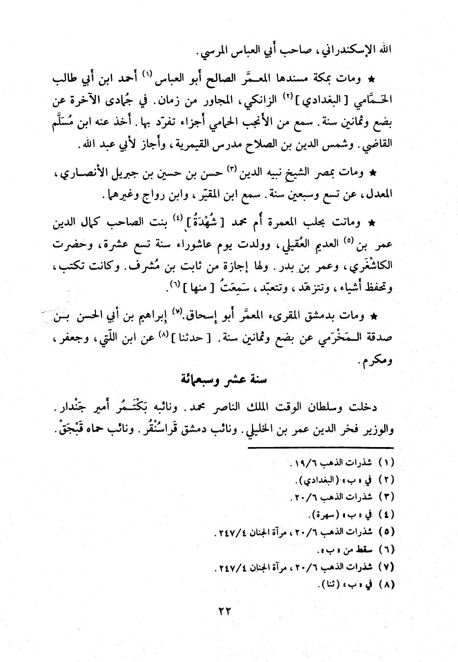 وماتت بحلب المعمرة أم محمد شهدة بنت الصاحب كمال الدين عمر بن العديم العقيلي، وولدت يوم عاشوراء سنة تسع عشرة، وحضرت الكاشغري، وعمر بن بدر. ولها إجازة من ثابت بن مشرف. وكانت تكتب، وتحفظ أشياء، وتتزهد، وتتعبد، سمعت منها.