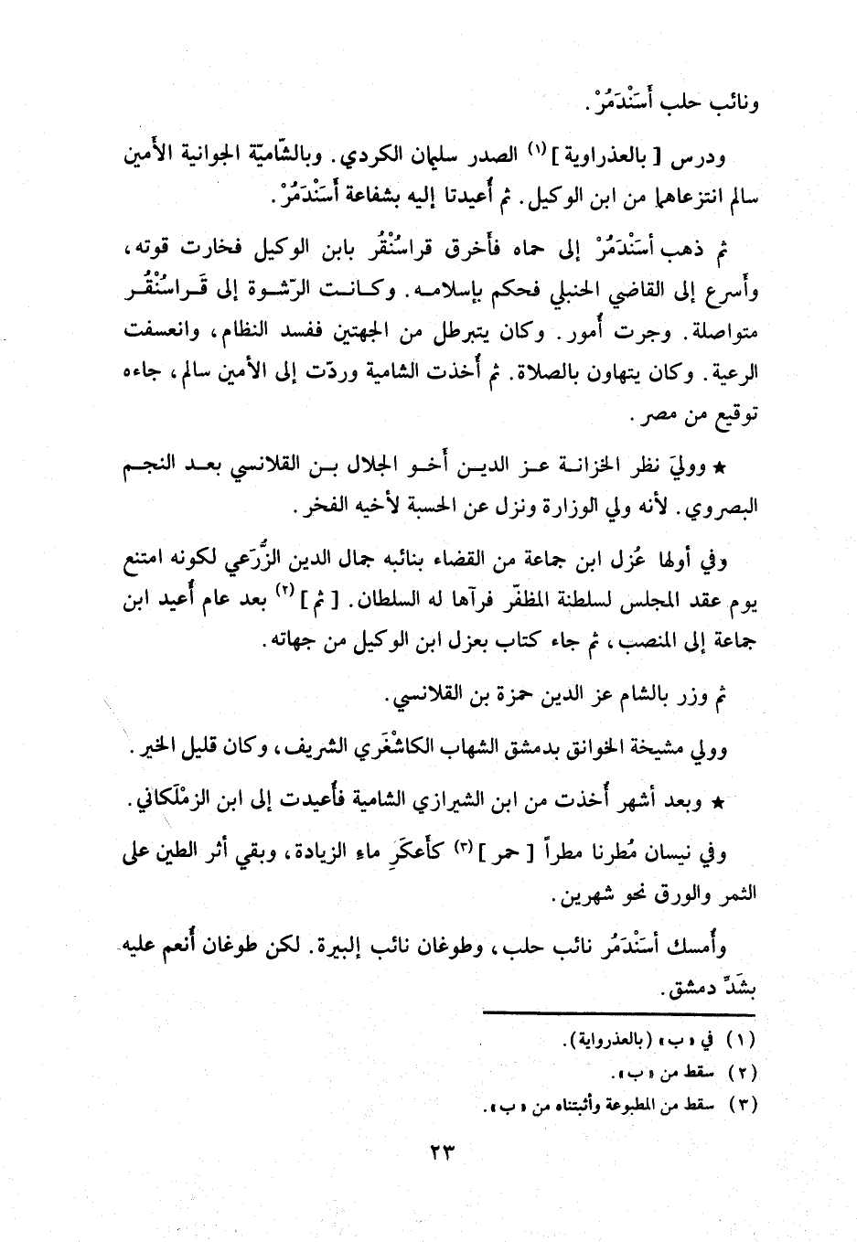 ثم ذهب أسندمر إلى حماه فأخرق قراسنقر بابن الوكيل فخارت قوته، وأسرع إلى القاضي الحنبلي فحكم بإسلامه. وكانت الرشوة إلى قراسنقر متواصلة. وجرت أمور. وكان يتبرطل من الجهتين ففسد النظام، وانعسفت الرعية. وكان يتهاون بالصلاة. ثم أخذت الشامية وردت إلى الأمين سالم، جاءه توقيع من مصر. وولي نظر الخزانة عز الدين أخو الجلال بن القلانسي بعد النجم البصروي. لأنه ولي الوزارة ونزل عن الحسبة لأخيه الفخر.