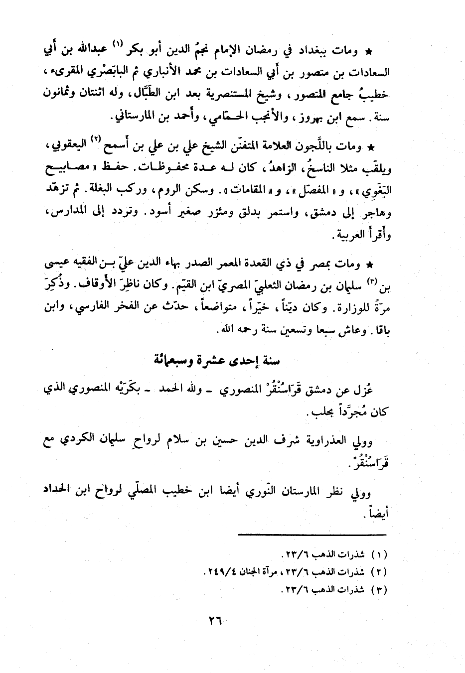ومات ببغداد في رمضان الإمام نجم الدين أبو بكر عبد الله بن أبي السعادات بن منصور بن أبي السعادات بن محمد الأنباري ثم البابصري المقرىء، خطيب جامع المنصور، وشيخ المستنصرية بعد ابن الطبال، وله اثنتان وثمانون سنة. سمع ابن بهروز، والأنجب الحمامي، وأحمد بن المارستاني.