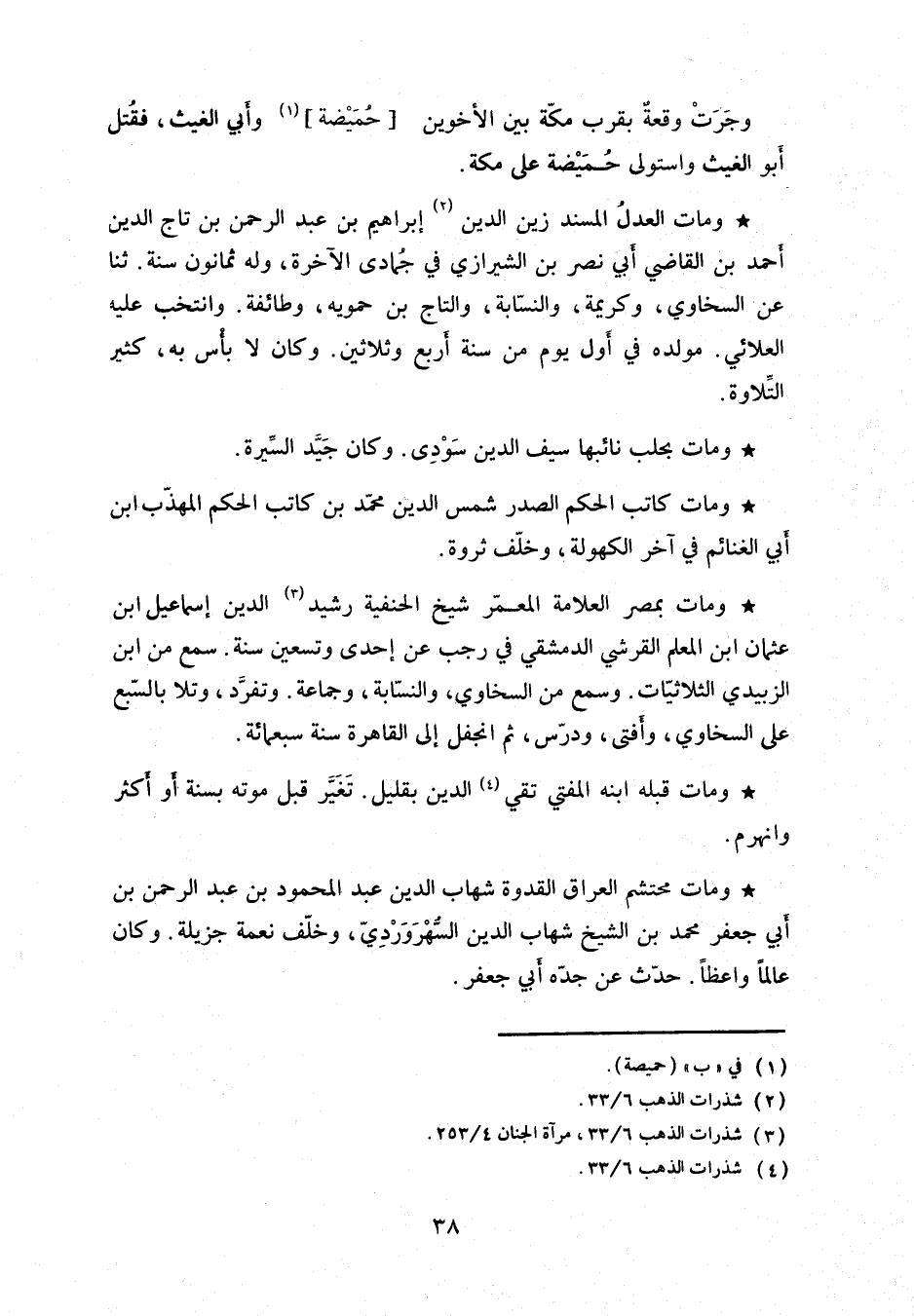 ومات بمصر العلامة المعمر شيخ الحنفية رشيد الدين إسماعيل ابن عثمان ابن المعلم القرشي الدمشقي في رجب عن إحدى وتسعين سنة. سمع من ابن الزبيدي الثلاثيات. وسمع من السخاوي، والنسابة، وجماعة. وتفرد، وتلا بالسبع على السخاوي، وأفتى، ودرس، ثم انجفل إلى القاهرة سنة سبعمائة.