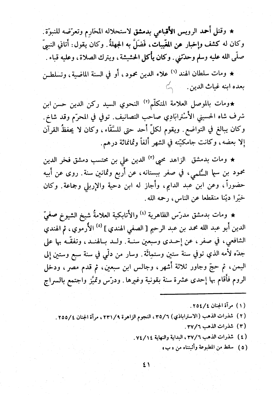 ومات بالموصل العلامة المتكلم النحوي السيد ركن الدين حسن ابن شرف شاه الحسيني الأسترابادي صاحب التصانيف. توفي في المحرم وقد شاخ. وكان يبالغ في التواضع. ويقوم لكل أحد حتى للسقاء، وكان لا يحفظ القرآن إلا بعضه، وكانت جامكيته في الشهر ألفاً وثمانمائة درهم.