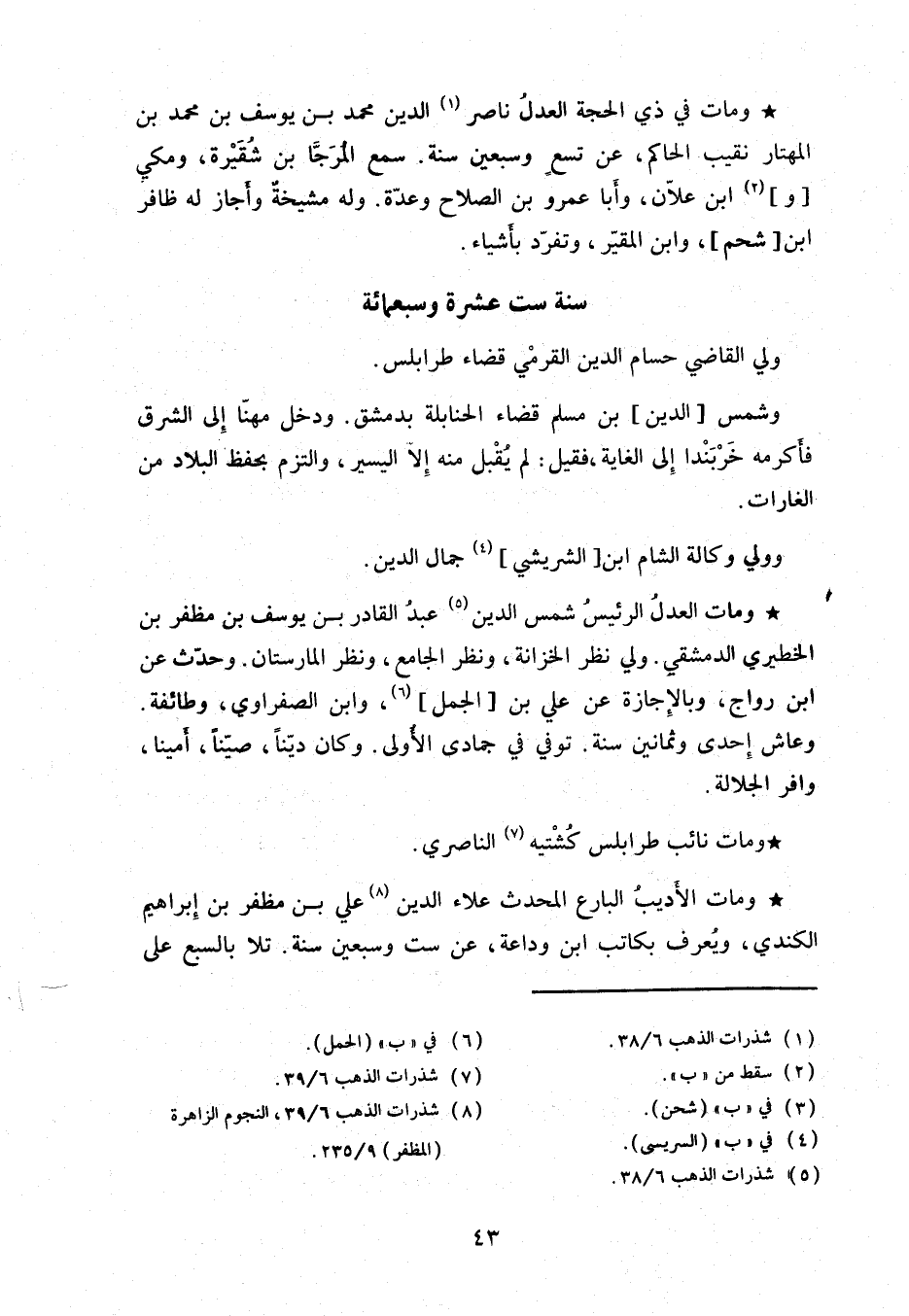 ومات نائب طرابلس كشتيه الناصري. ومات الأديب البارع المحدث علاء الدين علي ابن مظفر ابن إبراهيم الكندي، ويعرف بكاتب ابن وداعة، عن ستة وسبعين سنة. تلا بالسبع على