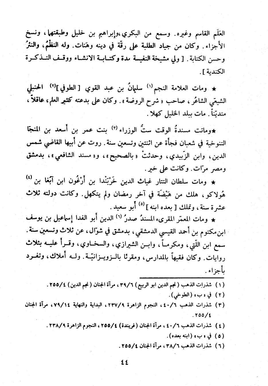 ومات العلامة النجم سليمان بن عبد القوي الطوفي الحنبلي الشيعي الشاعر، صاحب شرح الروضة، وكان على بدعته كثير العلم، عاقلاً، متديناً. مات ببلد الخليل كهلاً.