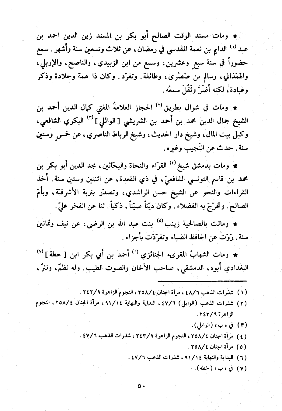 ومات مسند الوقت الصالح أبو بكر بن المسند زين الدين أحمد بن عبد الدايم بن نعمة المقدسي في رمضان، عن ثلاث وتسعين سنة وأشهر. سمع حضوراً في سنة سبعٍ وعشرين، وسمع من ابن الزبيدي، والناصح، والإربلي، والهمذاني، وسالم بن صصرى، وطائفة. وتفرد. وكان ذا همة وجلادة وذكر وعبادة، لكنه أضر وثقل سمعه.