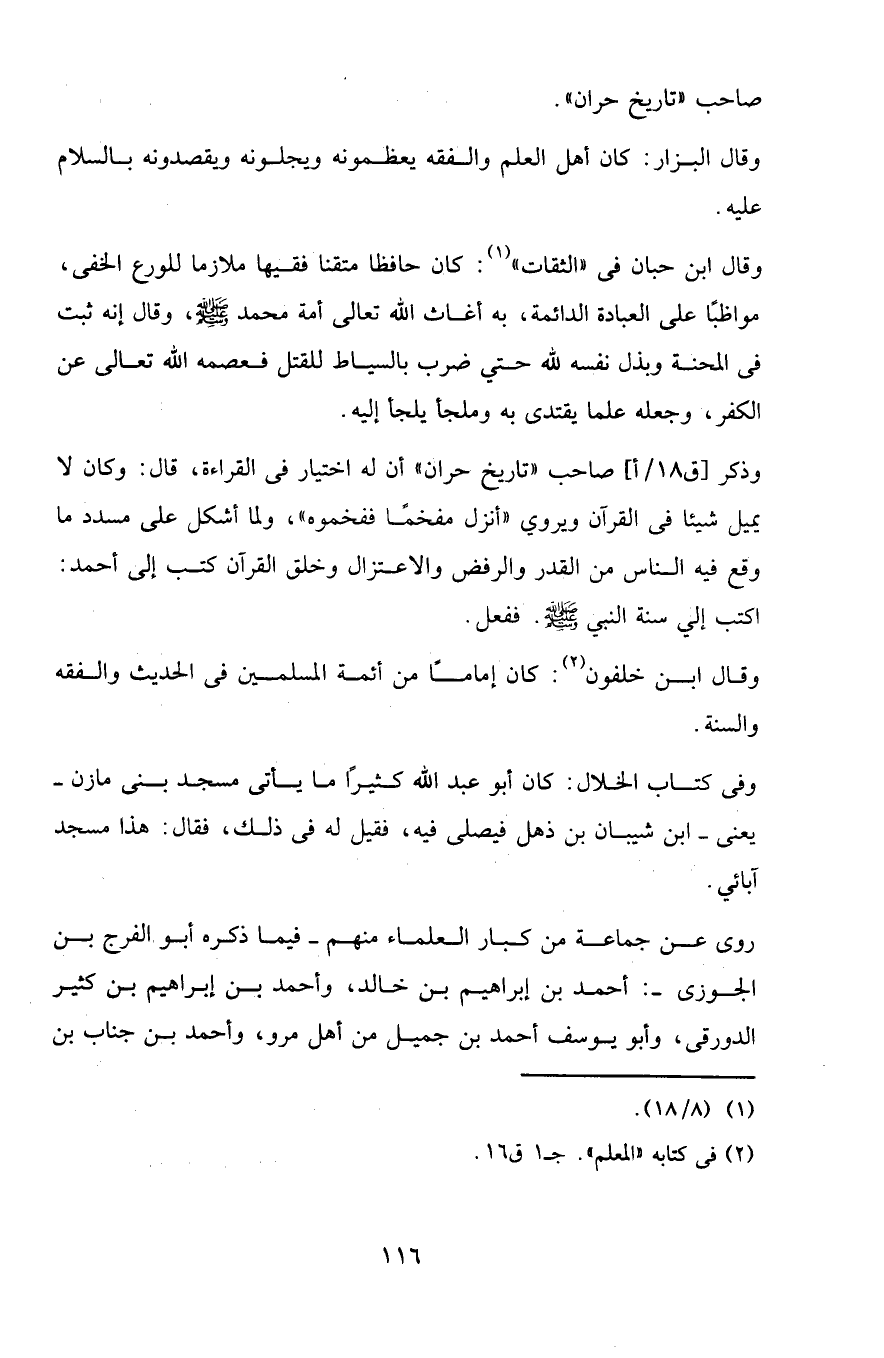 وقال ابن حبان في " الثقات ": كان حافظا متقنا فقيها ملازما للورع الحنفي، مواظبا على العبادة الدائمة، به أغاث الله تعالى أمة محمد صلى الله عليه وسلم، وقال إنه ثبت في المحنة وبذل نفسه لله حتى ضرب بالسياط للقتل فعصمه الله تعالى عن الكفر، وجعله علما يقتدى به وملجأ يلجأ إليه.