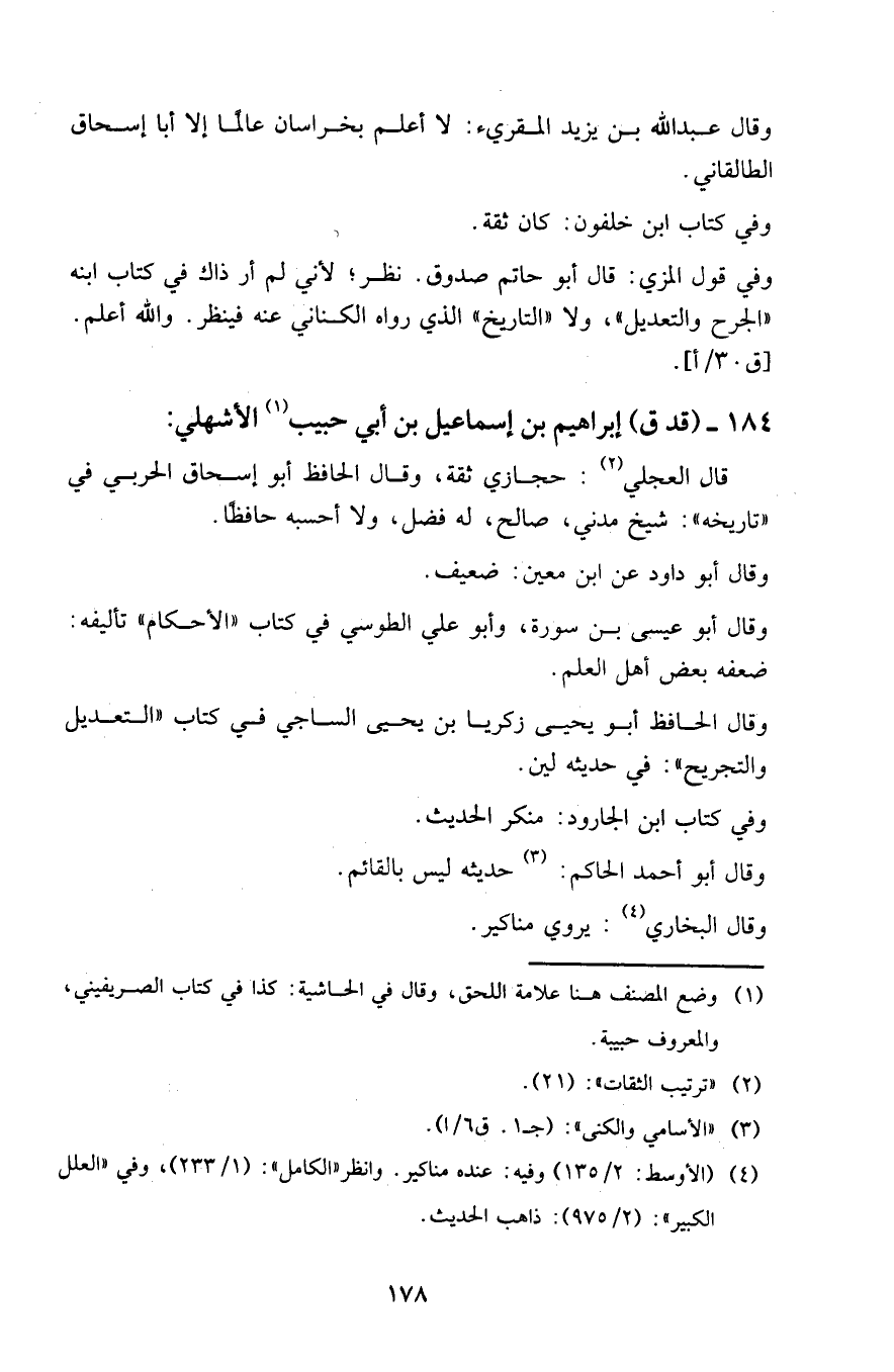 ١٨٤ - (قد ق) إبراهيم بن إسماعيل بن أبي حبيب الأشهلي: قال العجلي: حجازي ثقة، وقال الحافظ أبو إسحاق الحربي في " تاريخه ": شيخ مدني، صالح، له فضل، ولا أحسبه حافظا.