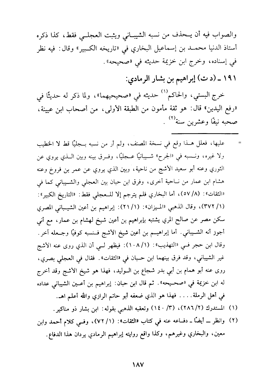والصواب فيه أن يحذف من نسبه الشيباني ويثبت العجلي فقط، كذا ذكره أستاذ الدنيا محمد بن إسماعيل البخاري في " تاريخه الكبير " وقال: فيه نظر في إسناده، وخرج ابن خزيمة حديثه في " صحيحه ".
