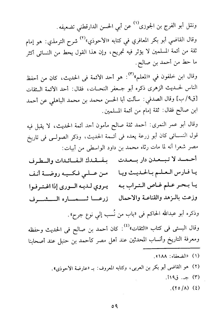 وقال القاضي أبو بكر المعافري في كتابه " الأحوذي " شرح الترمذي: هو إمام ثقة من أئمة المسلمين لا يؤثر فيه تجريح، وإن هذا القول يحط من النسائي أكثر ما حط من أحمد بن صالح.