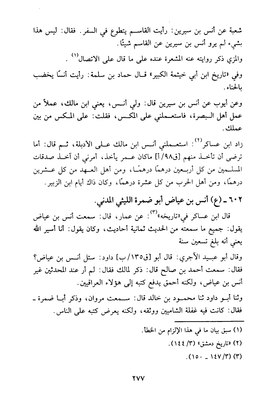 قال ابن عساكر في «تاريخه»: عن عمار، قال: سمعت أنس بن عياض يقول: جميع ما سمعته من الحديث ثمانية أحاديث، وكان يقول: أنا أسير الله يعني أنه بلغ تسعين سنة، وقال أبو عبيد الآجري: قال أبو [ق ١٣٥ / ب] داود: سئل أنس بن عياض؟ فقال: سمعت أحمد بن صالح قال: ذكر لمالك فقال: لم أر عند المحدثين غير أنس بن عياض، ولكنه أحمق يدفع كتبه إلى هؤلاء العراقيين.