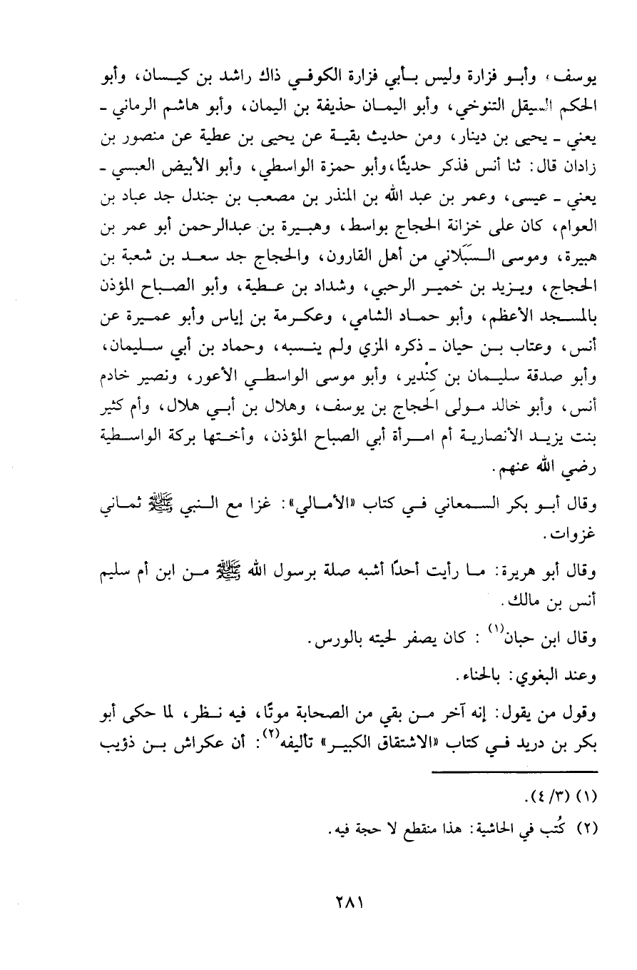 يوسف، وأبو فزارة وليس بأبي فزارة الكوفي ذاك راشد بن كيسان، وأبو الحكم السيقل التنوخي، وأبو اليمان حذيفة بن اليمان، وأبو هاشم الرماني - يعني - يحيى بن دينار، ومن حديث بقية عن يحيى بن عطية، عن منصور بن زادان قال: ثنا أنس فذكر حديثا، وأبو حمزة الواسطي، وأبو الأبيض العبسي - يعني - عيسى، وعمر بن عبد الله بن المنذر بن مصعب بن جندل جد عباد بن العوام، كان على خزانة الحجاج بواسط، وهبيرة بن عبد الرحمن أبو عمر بن هبيرة، وموسى السَبَلاني من أهل القارون، والحجاج جد سعد بن شعبة بن الحجاج، ويزيد بن خمير الرحبي، وشداد بن عطية، وأبو الصباح المؤذن بالمسجد الأعظم، وأبو حماد الشامي، وعكرمة بن إياس وأبو عميرة عن أنس، وعتاب بن حيان - ذكره المزي ولم ينسبه، وحماد بن أبي سليمان، وأبو صدقة سليمان بن كِنْدير، وأبو موسى الواسطي الأعور، ونصير خادم أنس، وأبو خالد مولى الحجاج بن يوسف، وهلال بن أبي هلال، وأم كثير بنت يزيد الأنصارية أم امرأة أبي الصباح المؤذن، وأختها بركة الواسطية رضي الله عنهم.