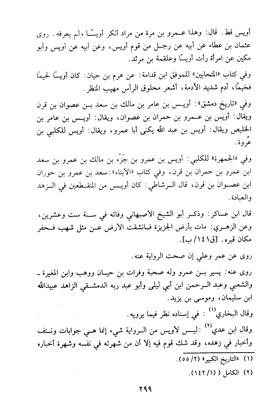 وقال ابن عدي: ليس لأويس من الرواية شيء إنما هي جوابات ونتف وأخبار في زهده، وقد شك قوم فيه إلا أن من شهرته في نفسه وشهرة أخباره