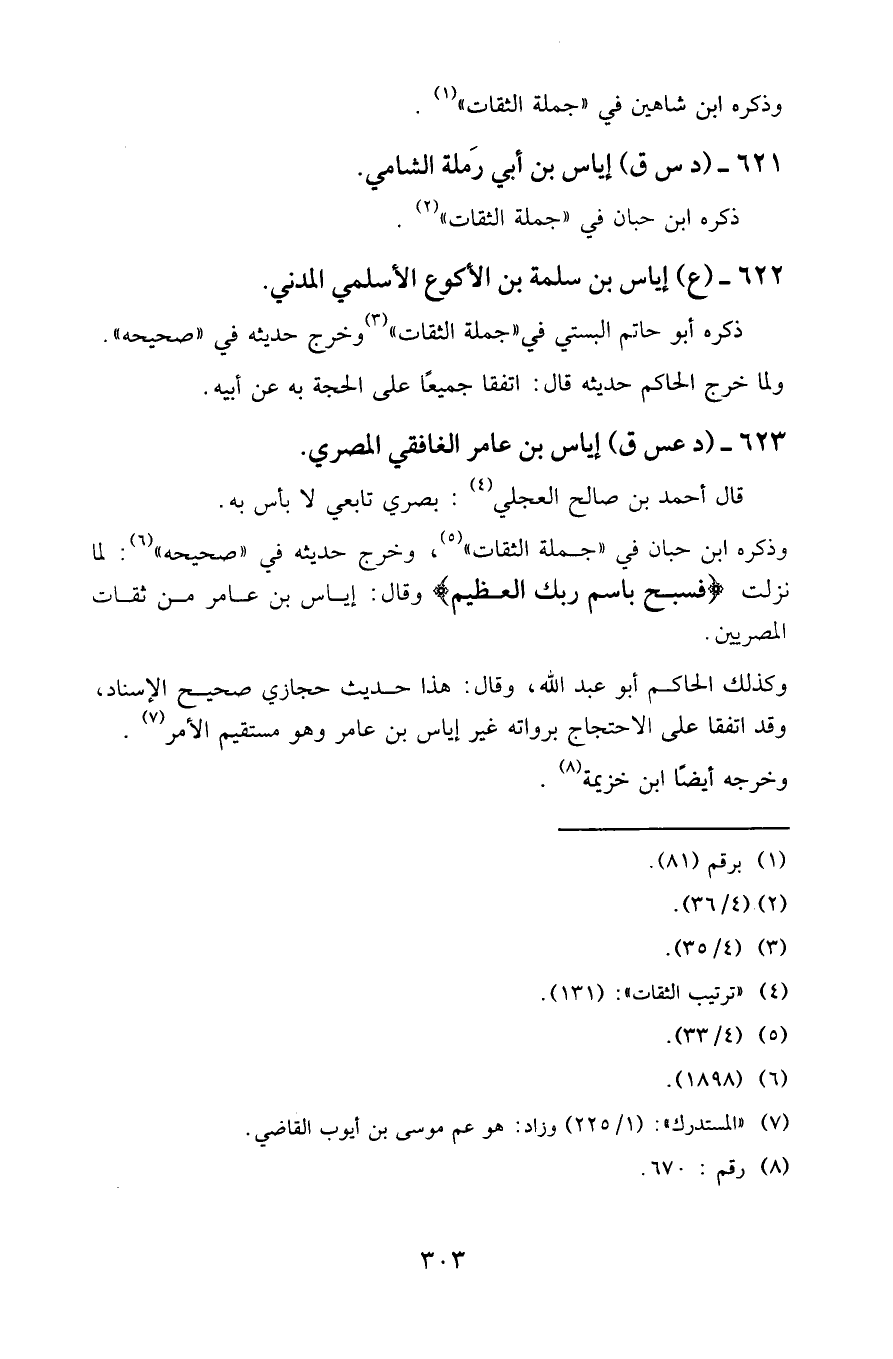وذكره ابن حبان في «جلمة الثقات»، وخرج حديثه في «صحيحه»: لما نزلت «فسبح باسم ربك العظيم» وقال: إياس بن عامر من ثقات المصريين.