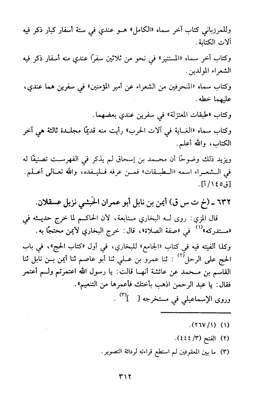 وللمرزباني كتاب آخر سماه «الكامل» هو عندي في ستة أسفار كبار ذكر فيه آلات الكتابة.