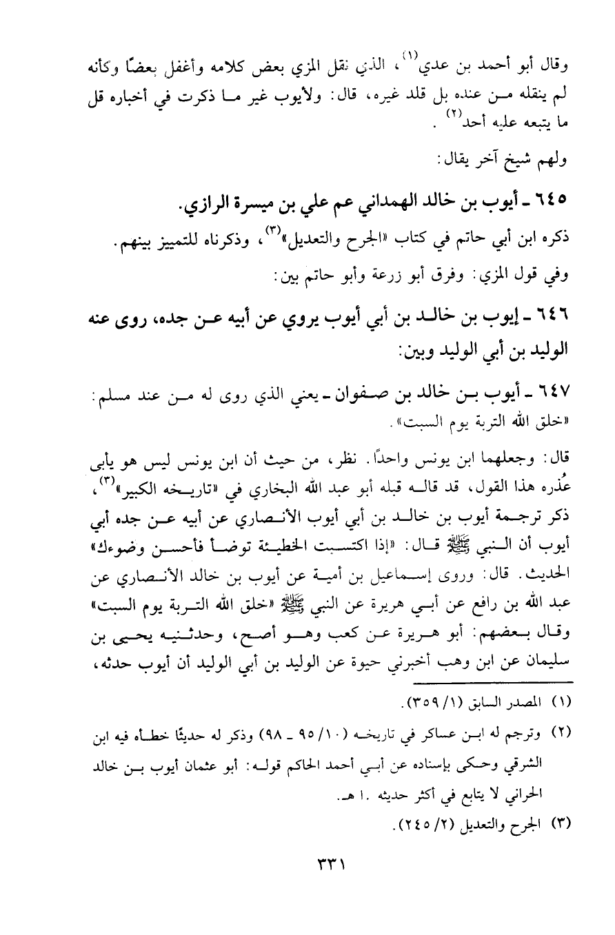 ٦٤٧ - أيوب بن خالد بن صفوان - يعني الذي روى له من عند مسلم: «خلق الله التربة يوم السبت».