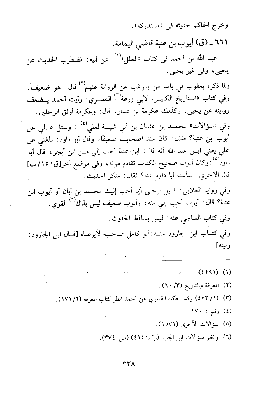 وقال أبو داود: بلغني عن علي يعني ابن عبد الله أنه قال: ابن عتبة أحب إلي من ابن أبجر، قال أبو داود: وكان أيوب صحيح الكتاب تقادم موته، وفي موضع آخر [ق ١٥١ / ب] قال الآجري: سألت أبا داود عنه؟ فقال: منكر الحديث.