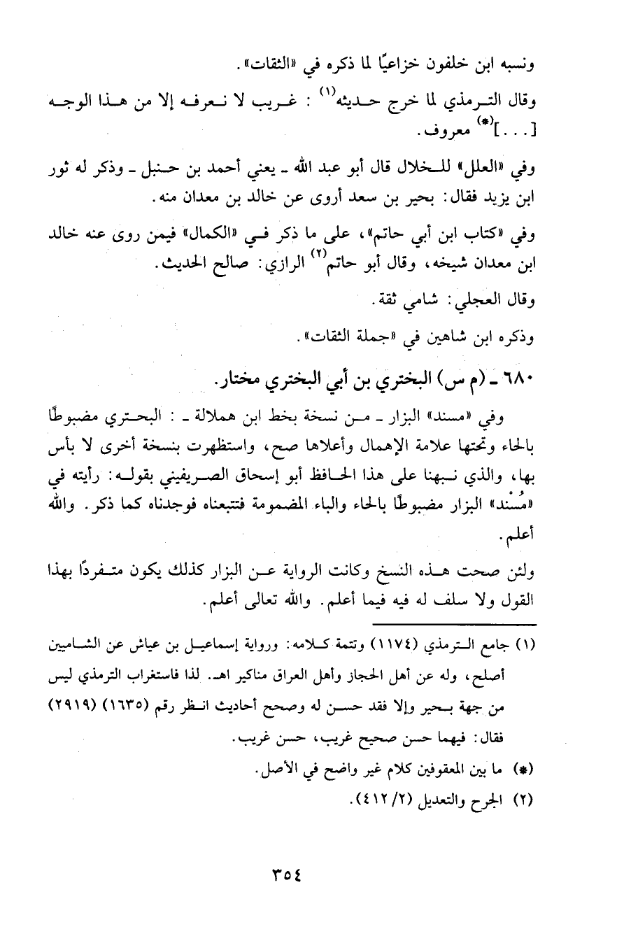 وفي «مسند» البزار - من نسخة بخط ابن هملالة -: البحتري مضبوطا بالحاء وتحتها علامة الإهمال وأعلاها صح، واستظهرت بنسخة أخرى لا بأس بها، والذي نبهنا على هذا الحافظ أبو إسحاق الصريفيني بقوله: رأيته في «مسند» البزار مضبوطاً بالحاء والباء المضمومة فتتبعناه فوجدناه كما ذكر.