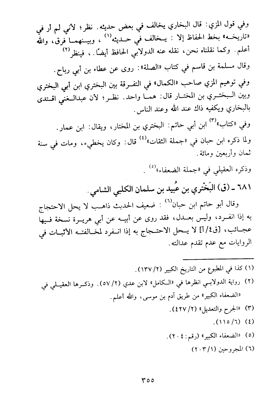 وكما نقلناه نحن، نقله عنه الدولابي الحافظ أيضا، فينظر، وقال مسلمة بن قاسم في كتاب «الصلة»: روى عن عطاء بن أبي رباح. وفي توهيم المزي صاحب «الكمال» في التفرقة بين البختري ابن أبي البختري وبين البختري بن المختار قال: هما واحد. نظر، لأن عبد الغني اقتدى بالبخاري ويكفيه ذاك عند الله وعند الناس.