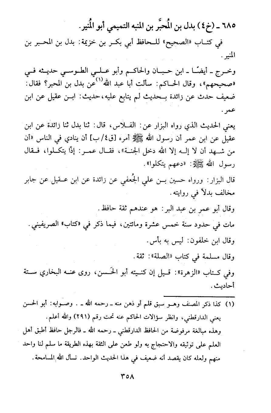وخرج - أيضا - ابن حبان والحاكم وأبو علي الطوسي حديثه في «صحيحهم»، وقال الحاكم: سألت أبا عبد الله عن بدل بن المحبر؟ فقال: ضعيف حدث عن زائدة بحديث لم يتابع عليه، حديث: ابن عقيل عن ابن عمر.