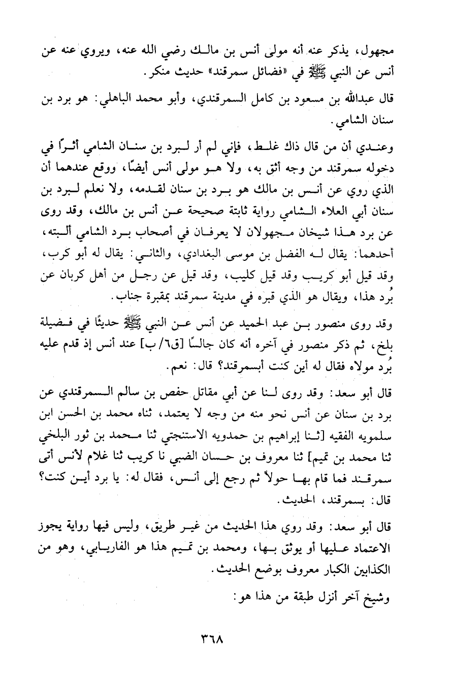 وعندي أن من قال ذاك غلط، فإني لم أر لبرد بن سنان الشامي أثراً في دخوله سمرقند من وجه أثق به، ولا هو مولى أنس أيضاً، ووقع عندهما أن الذي روى عن أنس بن مالك هو برد بن سنان لقدمه، ولا نعلم لبرد بن سنان أبي العلاء الشامي رواية ثابتة صحيحة عن أنس بن مالك، وقد روى عن برد هذا شيخان مجهولان لا يعرفان في أصحاب برد الشامي ألبتة، أحدهما: يقال له الفضل بن موسى البغدادي، والثاني: يقال له أبو كرب، وقد قيل أبو كريب وقد قيل كليب، وقد قيل عن رجل من أهل كربان عن برد هذا، ويقال هو الذي قبره في مدينة سمرقند بمقبرة جناب.