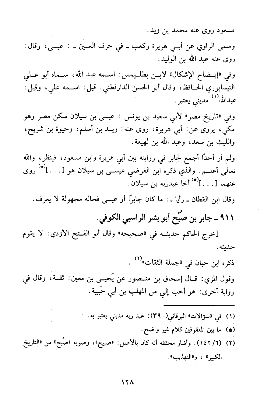 ولم أر أحدا أجمع لجابر في روايته بين أبي هريرة وابن مسعود، فينظر، والله تعالى أعلم. والذي ذكره ابن الفرضي عيسى بن سيلان هو [. . . .] روى عنهما [. . .] أخا عبد ربه بن سيلان.