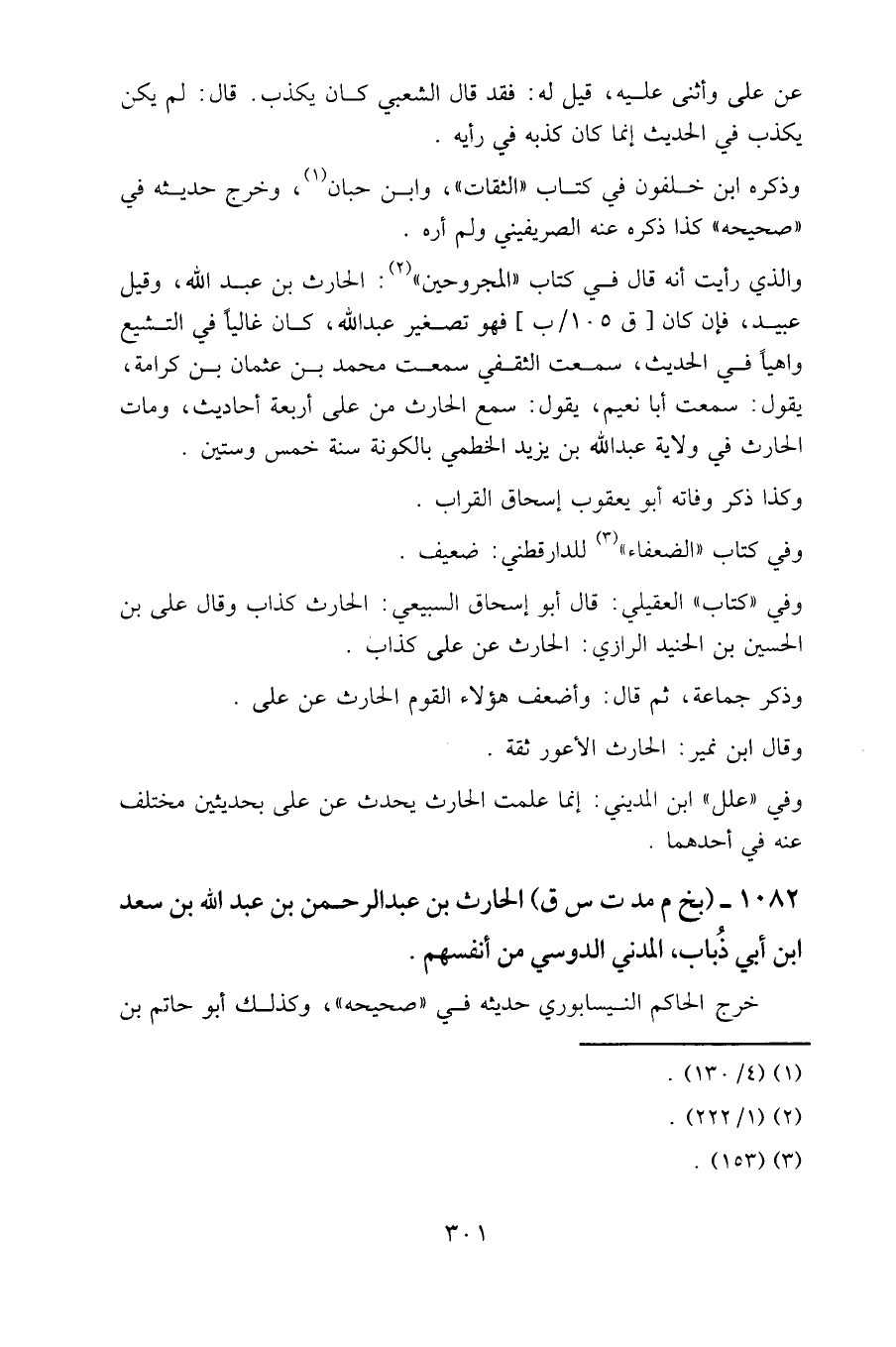 وفي «كتاب» العقيلي: قال أبو إسحاق السبيعي: الحارث كذاب وقال علي بن الحسين بن الحنيد الرازي: الحارث عن علي كذاب.