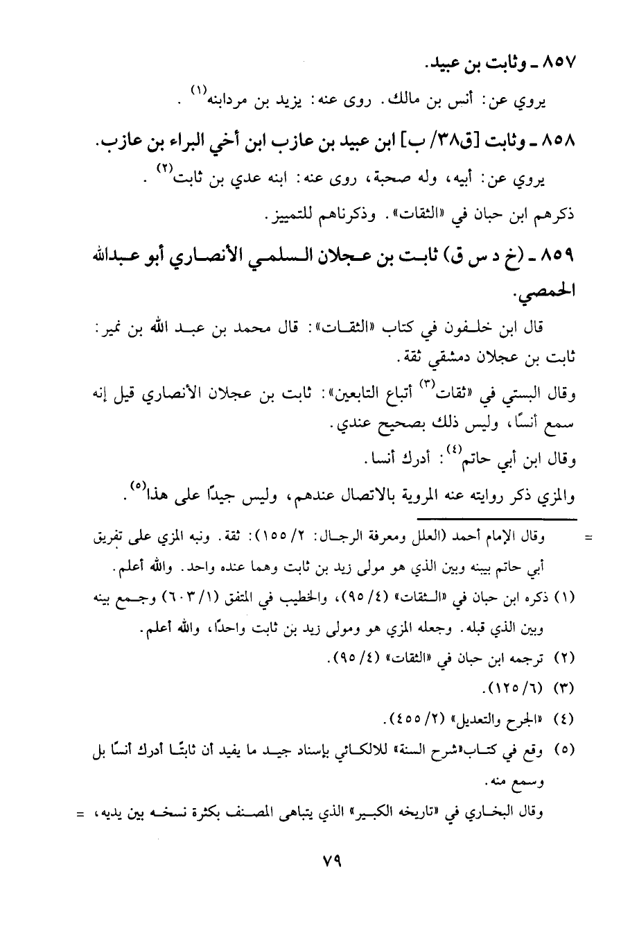 ٨٥٩ - (خ د س ق) ثابت بن عجلان السلمي الأنصاري أبو عبد الله الحمصي.