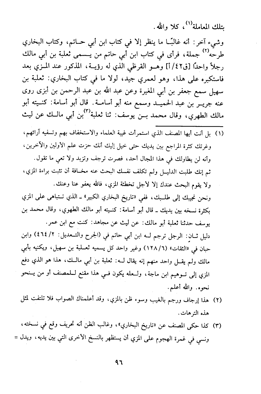 وشيء آخر: أنه غالبا ما ينظر إلا في كتاب ابن أبي حاتم، وكتاب البخاري طرحه جملة، فرأى في كتاب ابن أبي حاتم من يسمى ثعلبة بن أبي مالك رجلا واحدا [ق ٤٢ / أ] وهو القرظي الذي له رؤية، المذكور عند المزي بعد، فاستكبره على هذا، وهو لعمري جيد، لولا ما في كتاب البخاري: ثعلبة بن سهيل، سمع جعفر بن أبي المغيرة، وعن عبد الله بن عبد الرحمن بن أبزى، روي عنه جرير بن عبد الحميد، وسمع منه أبو أسامة: قال أبو أسامة: كنيته أبو مالك الطهري، وقال محمد بن يوسف: ثنا ثعلبة بن أبي مالك عن ليث