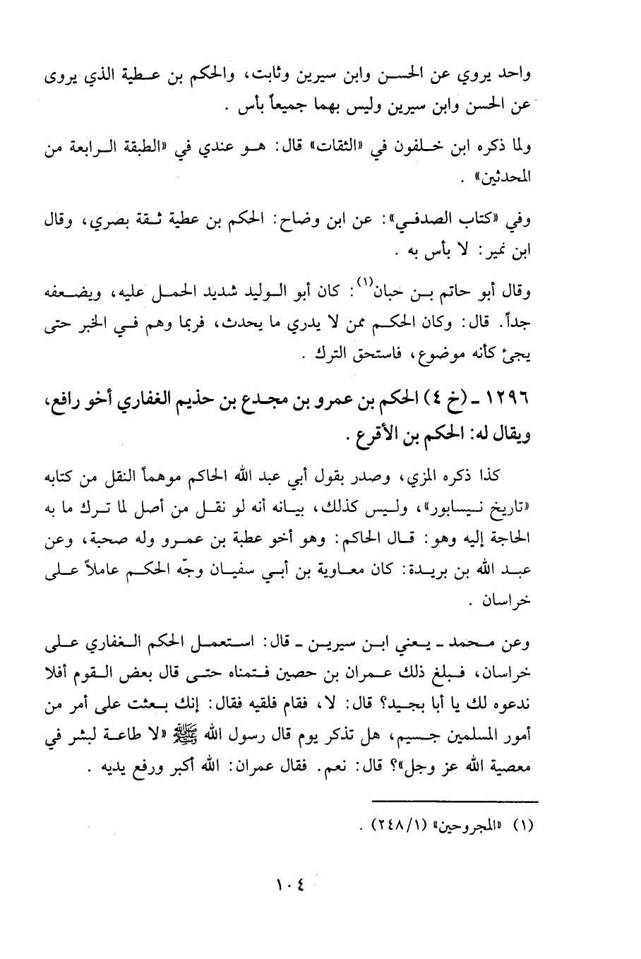 وعن محمد – يعني ابن سيرين - قال: استعمل الحكم الغفاري على خراسان، فبلغ ذلك عمران بن حصين فتمناه حتى قال بعض القوم أفلا ندعوه لك يا أبا بجيد؟ قال: لا، فقام فلقيه فقال: إنك بعثت على أمر من أمور المسلمين جسيم، هل تذكر يوم قال رسول الله صلى الله عليه وسلم «لا طاعة لبشر في معصية الله عز وجل» قال: نعم. فقال عمران: الله أكبر ورفع يديه.