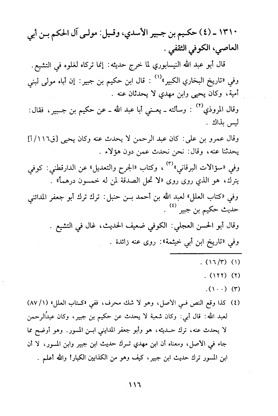١٣١٠ - (٤) حكيم بن جبير الأسدي، وقيل: مولى آل الحكم بن أبي العاصي، الكوفي الثقفي.