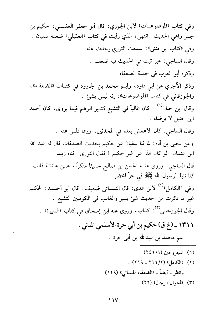 وفي «الكامل» لابن عدي: قال النسائي ضعيف. قال أبو أحمد: لحكيم غير ما ذكرت من الحديث شيء يسير والغالب في الكوفيين التشيع.