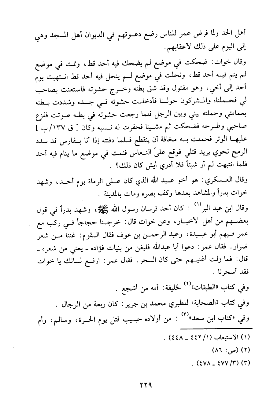 وقال خوات: ضحكت في موضع لم يضحك فيه أحد قط، ونمت في موضع لم ينم فيه أحد قط، ونحلت في موضع لم ينحل فيه أحد قط انتهيت يوم أحد إلى أخي، وهو مقتول، وقد شق بطنه، وخرج حشوته، فاستعنت بصاحب لي فحملناه والمشركون حولنا، فأدخلت حشوته في جسده وشددت بطنه بعمامتي، وحملته بيني وبين الرجل، فلما رجعت حشوته في بطنه صوتت ففزع صاحبي وطرحه، فضحكت ثم مشينا فحفرت له نسبه، وكان عليها الوتر فحملت به مخافة أن ينقطع، فلما دفنته إذا أنا بفارس قد سدد الرمح نحوي يريد قتلي فوقع علي النعاس، فنمت في