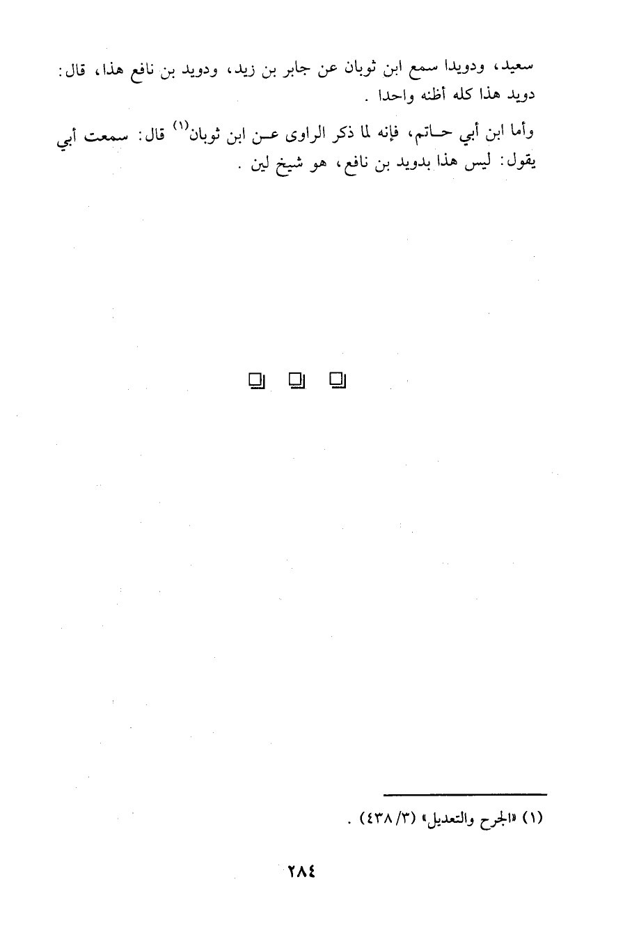 وأما ابن أبي حاتم، فإنه لما ذكر الراوي عن ابن ثوبان قال: سمعت أبي يقول: ليس هذا بدويد بن نافع، هو شيخ لين.